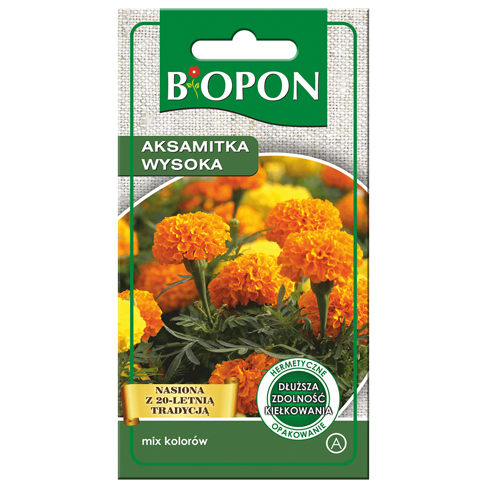 Tagetes erecta Roślina jednoroczna o dużych pomarańczowych kwiatach. Udaje się na każdej glebie ogrodowej. Zastosowanie: na kwiat cięty, na rabaty.
