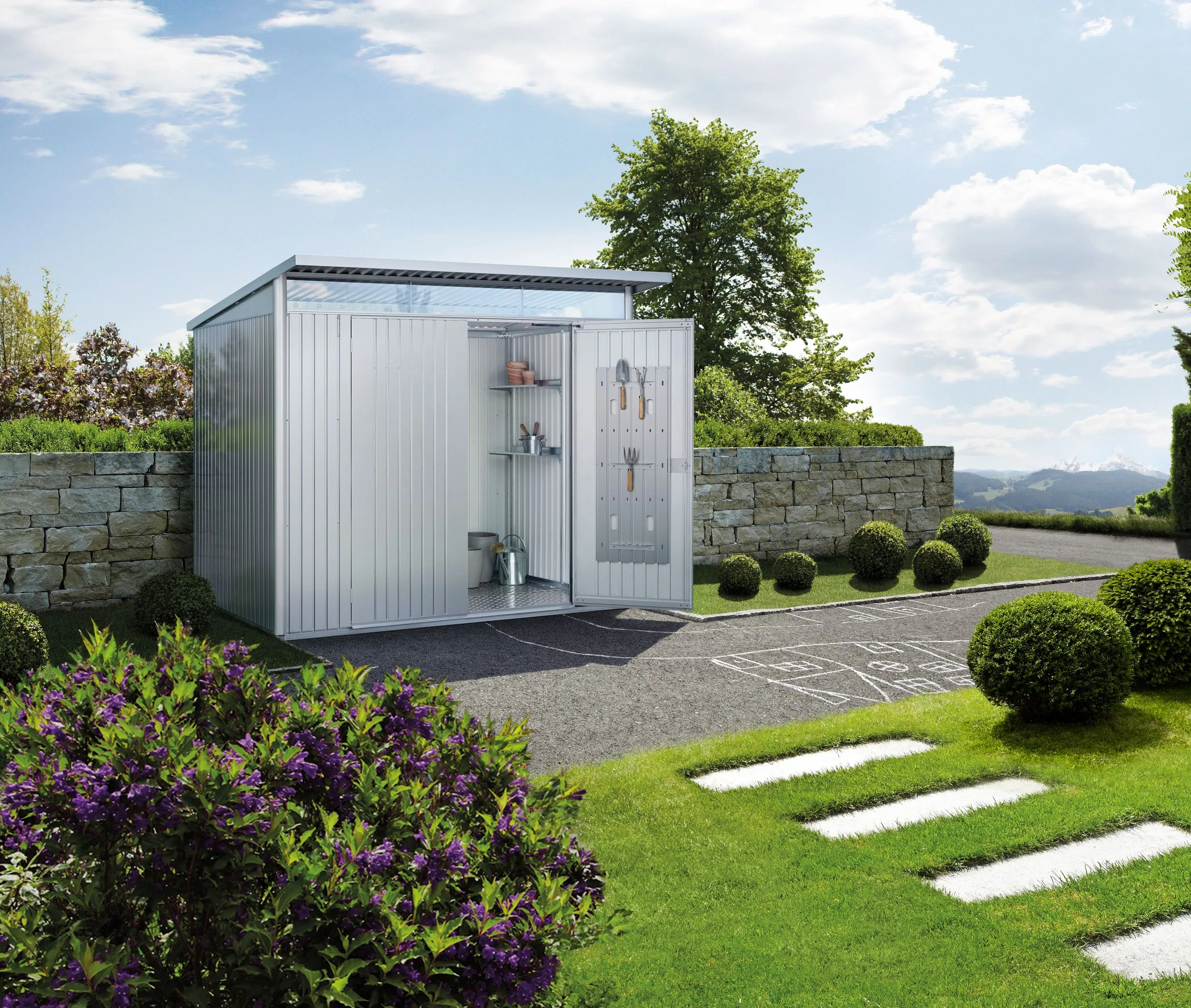 AvantGarde zasługuje na swoją nazwę. To wyjątkowo stabilny metalowy domek ogrodowy, który spełnia wymagania nowoczesnej architektury. Elegancki wygląd i liczne praktyczne zalety w codziennym użytkowaniu gwarantują pełną satysfakcję. Dożywotnia bezobsługowość pozwala zaoszczędzić pieniądze i cenny wolny czas.