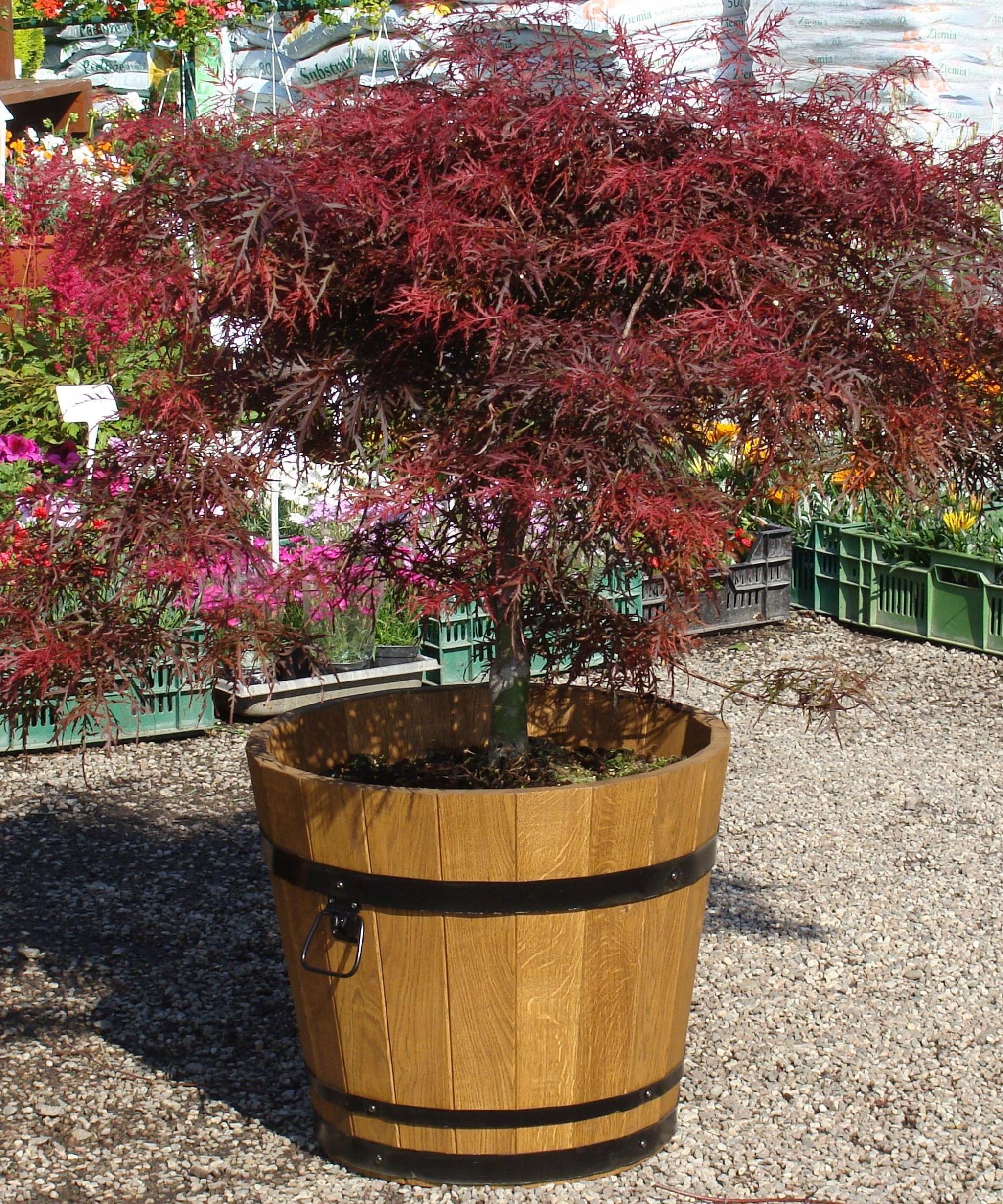 Donica posiada otwór drenażowy w grubym dnie z drewna dębowego.