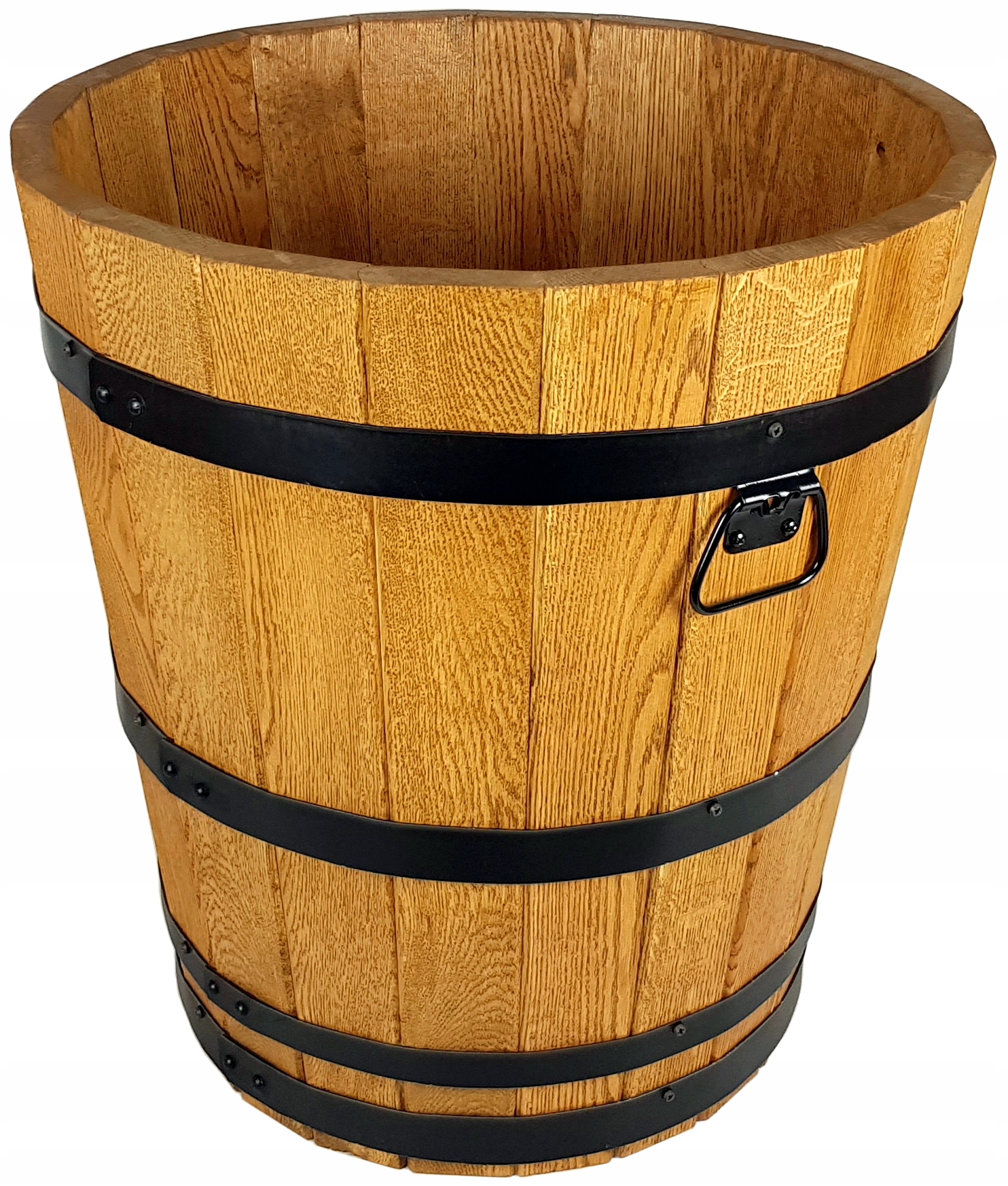 Donica posiada otwór drenażowy w grubym dnie z drewna dębowego.