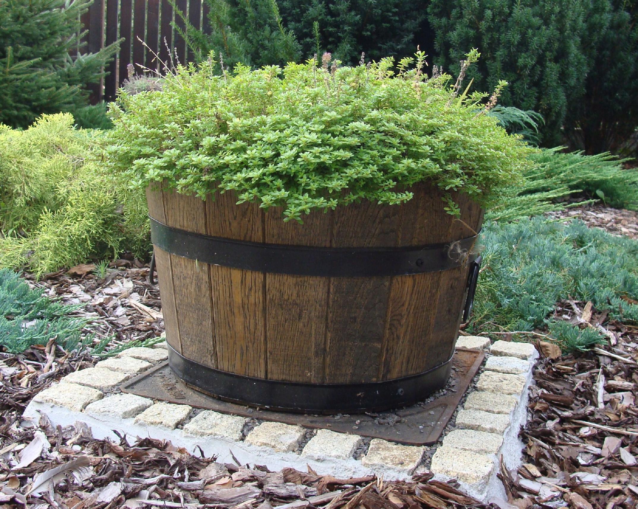 Donica posiada otwór drenażowy w grubym dnie z drewna sosnowego.