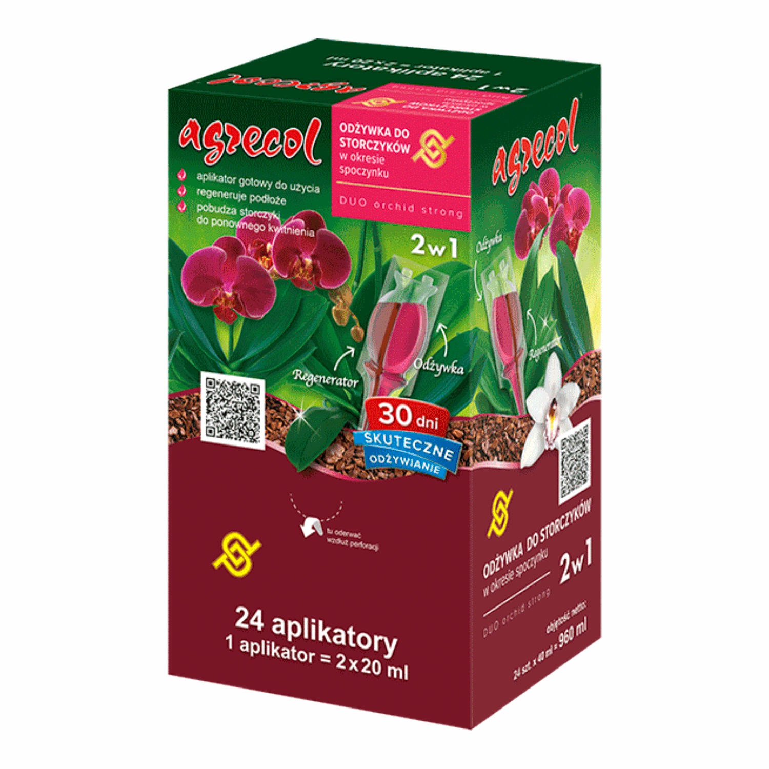 Duo Orchid Strong to połączenie dwóch formuł w jednym aplikatorze. 20 ml stanowi odżywka stanowiąca pożywkę dla rośliny, a drugie 20 ml to regenerator podłoża zawierający substancje humusowe.