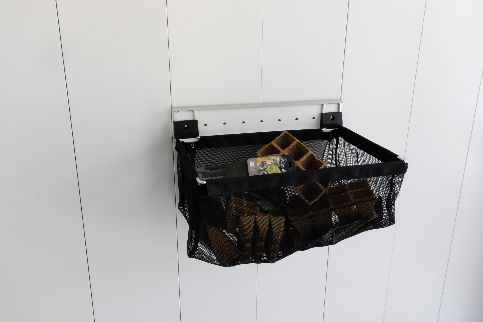 Torba wykonana z czarnej siatki poliestrowej, montowana na ścianie przy pomocy dołączonego uchwytu.