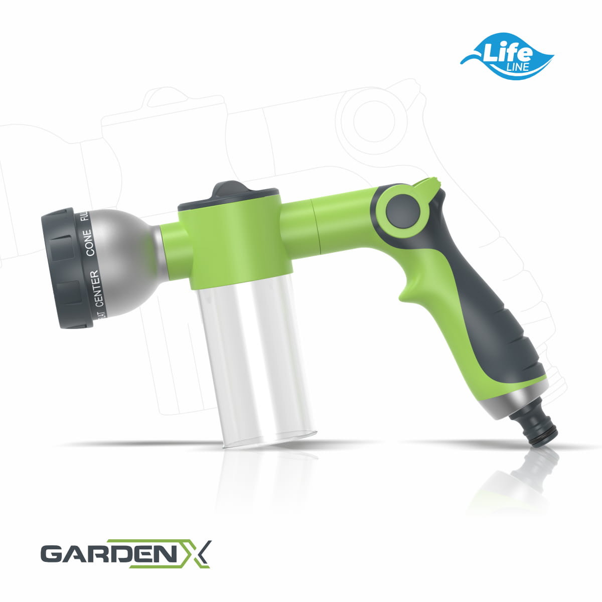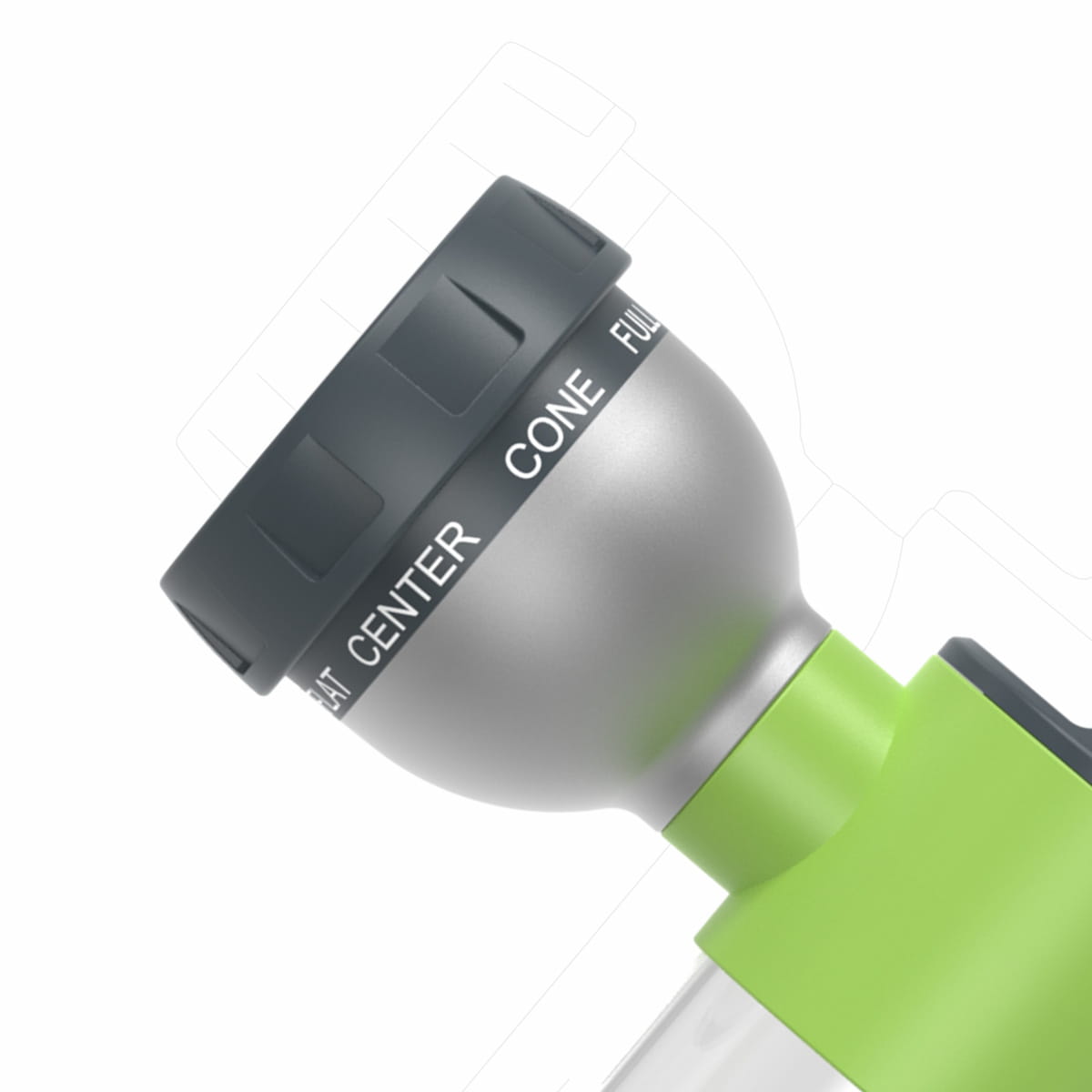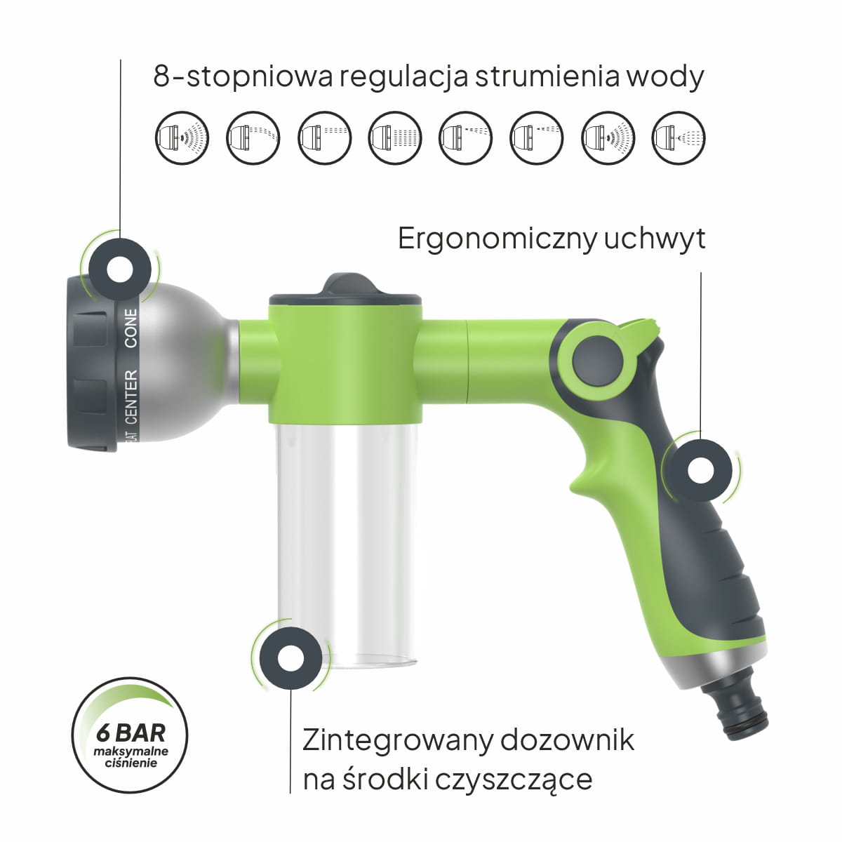 Umożliwia precyzyjne dopasowanie rodzaju strumienia do konkretnego zadania (np. delikatna mgiełka, silny strumień do mycia, strumień punktowy itd.). - Zintegrowany dozownik na środki czyszczące/nawozowe