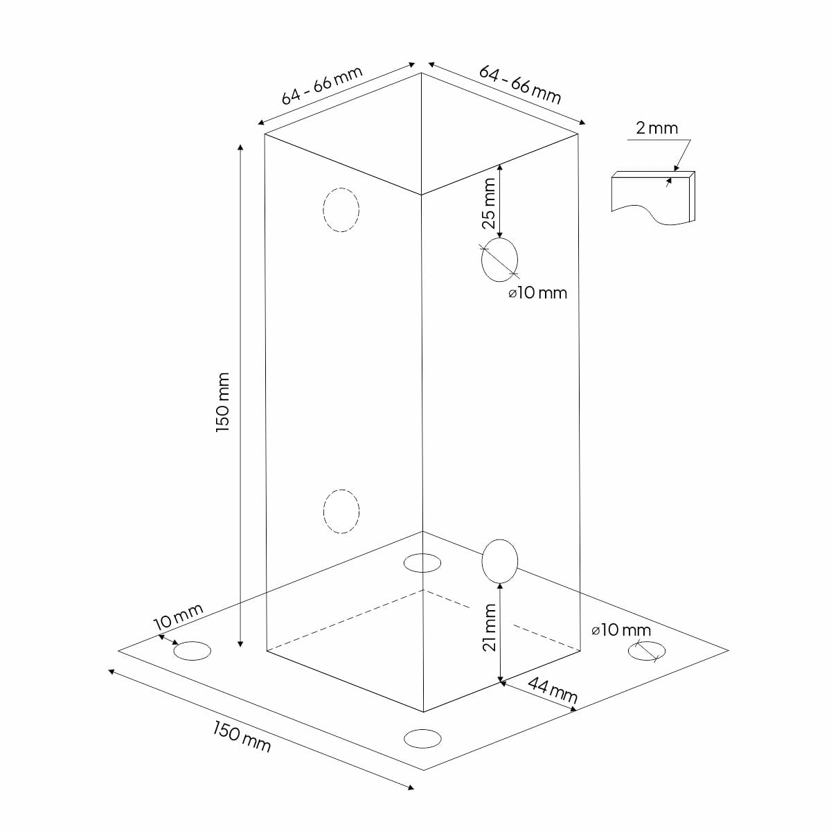 Dzięki solidnej podstawie z czterema otworami montażowymi, kotwa zapewnia stabilne i trwałe mocowanie do podłoża betonowego lub drewnianego. Idealna do montażu słupków, ogrodzeń, pergoli i konstrukcji drewnianych.