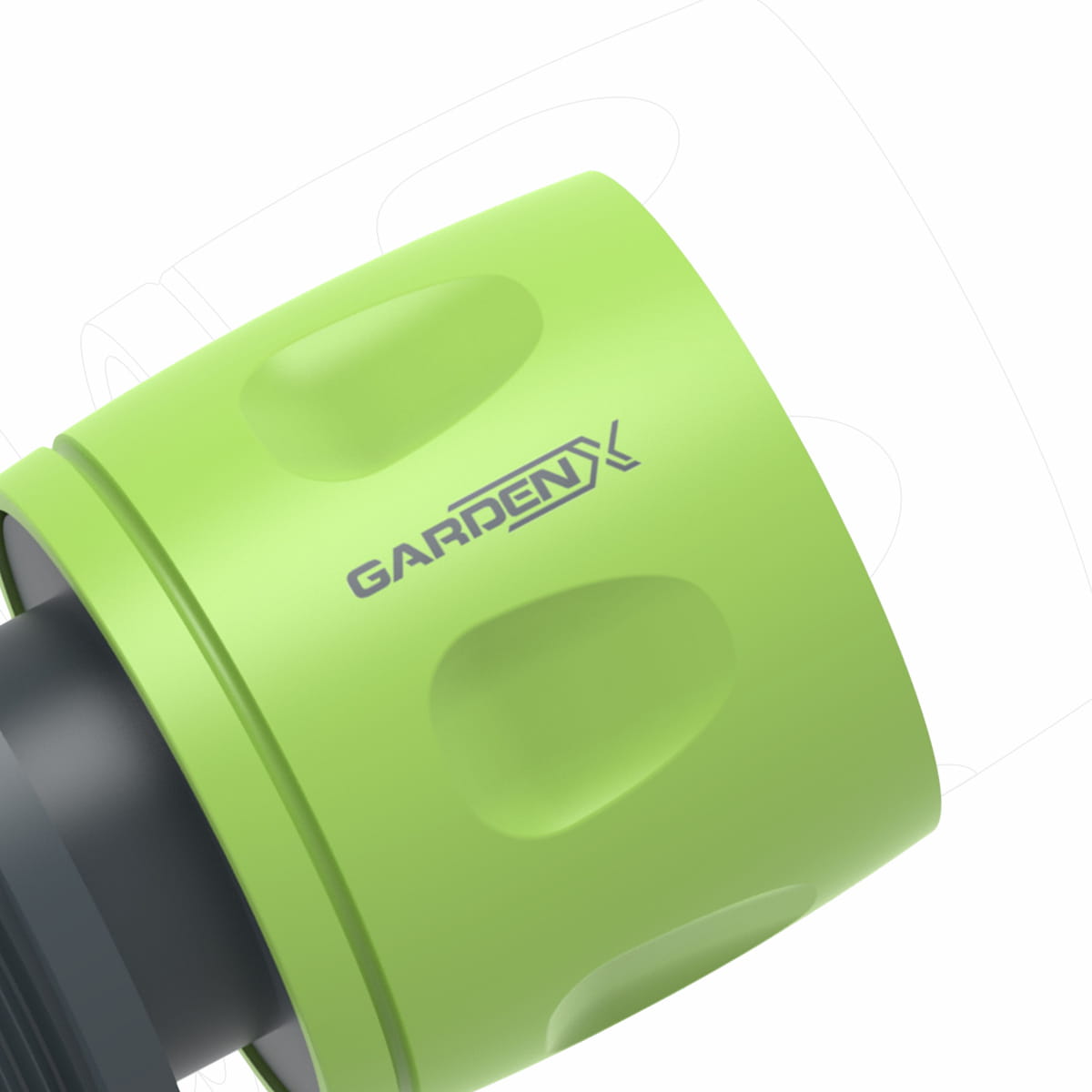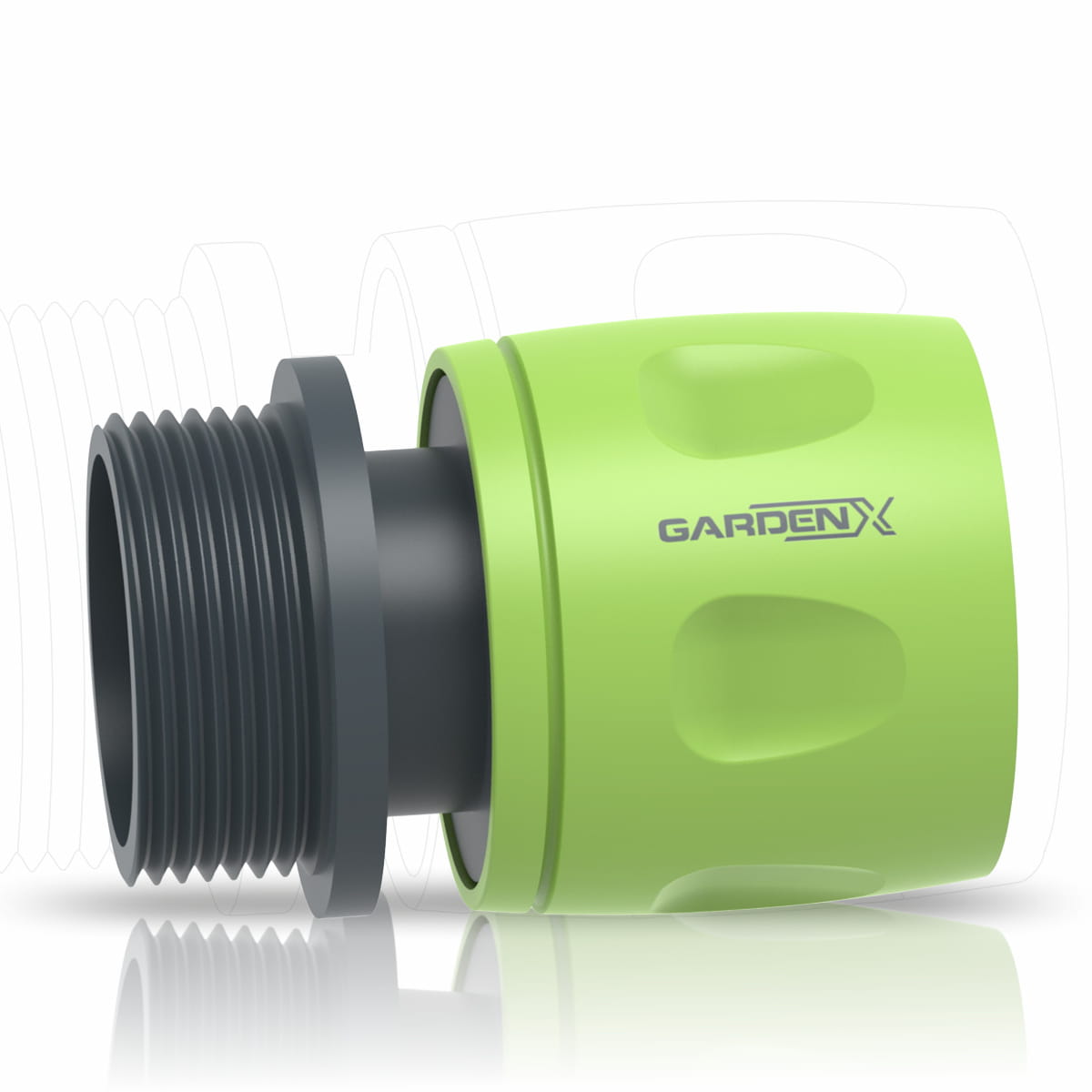TS3104 to funkcjonalne szybkozłącze marki Gardenx z gwintem zewnętrznym 3/4", wyposażone w praktyczną funkcję STOP, która umożliwia odłączanie akcesoriów bez konieczności zakręcania wody.