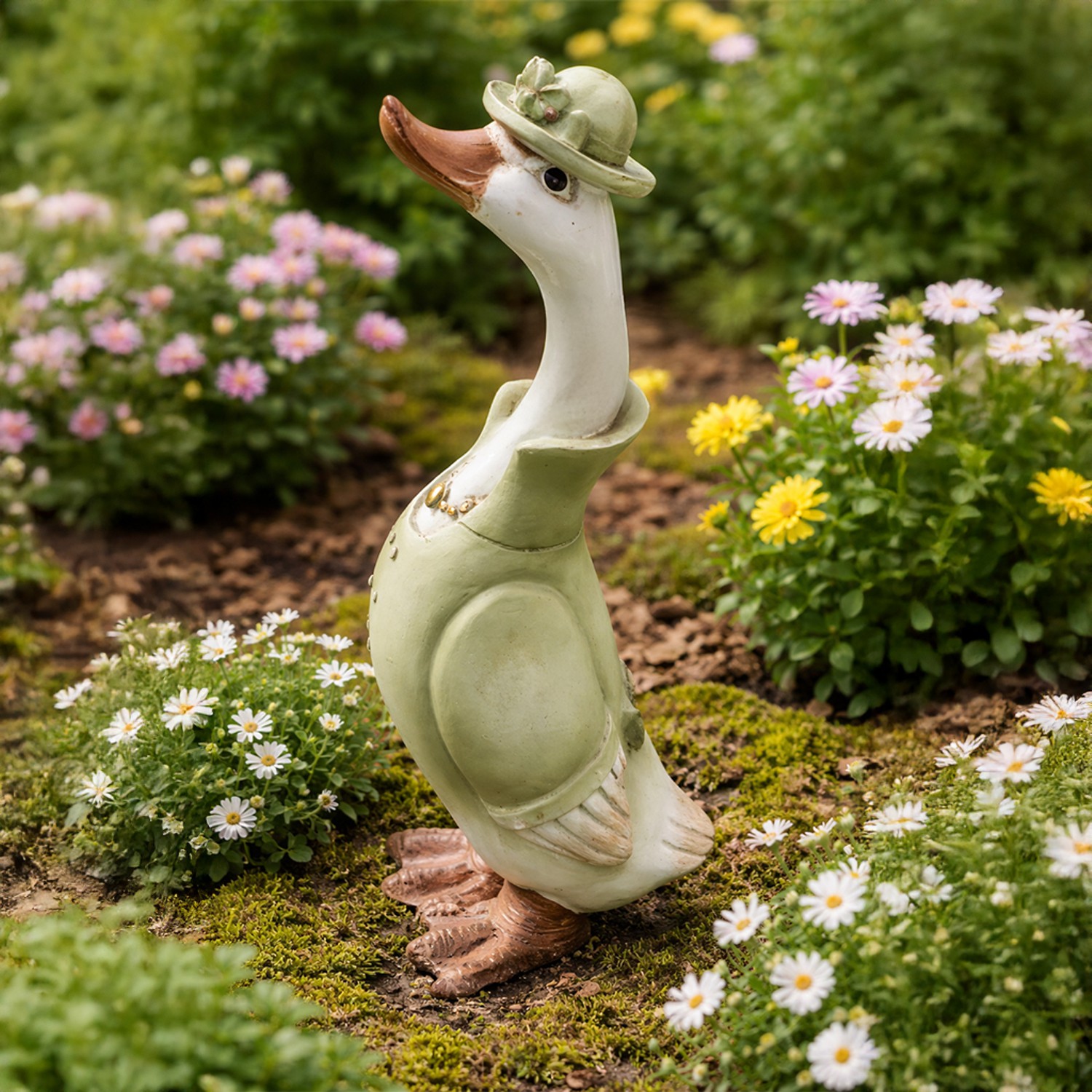 Smukła, elegancka kaczka w stylowym kapeluszu to wyjątkowa dekoracja, która nada Twojej przestrzeni sielski i jednocześnie subtelnie elegancki charakter. Wydłużona forma figurki sprawia, że prezentuje się lekko i efektownie – zarówno jako samodzielna ozdoba, jak i w towarzystwie innych dekoracji ogrodowych.