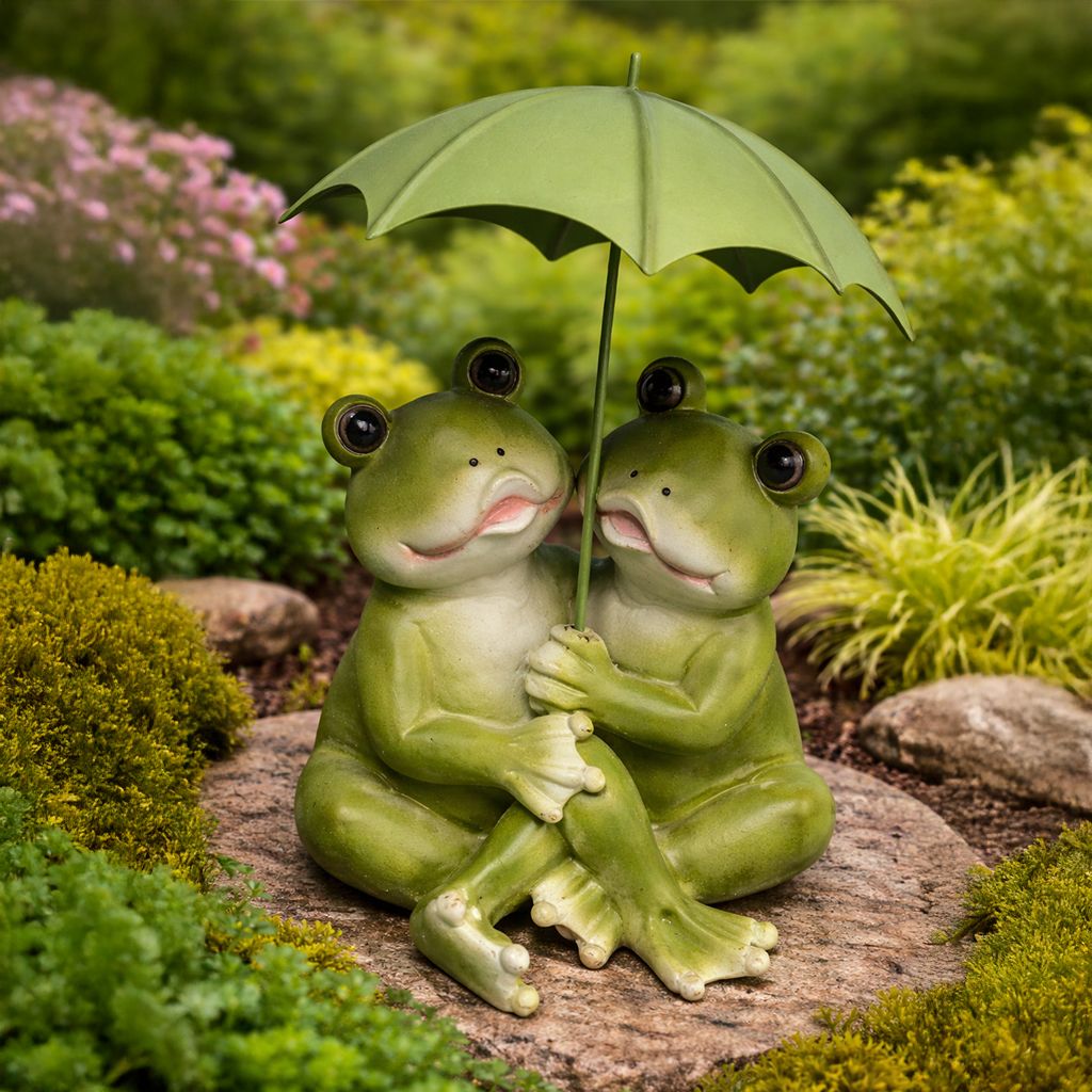 Urocza figurka przedstawiająca dwie żabki siedzące pod wspólnym parasolem to wyjątkowa dekoracja, która wprowadzi do ogrodu romantyczny i bajkowy klimat. Bliskość postaci, subtelne uśmiechy oraz starannie wykonany parasol tworzą ciepłą, przyjazną kompozycję, idealną do naturalnych aranżacji.