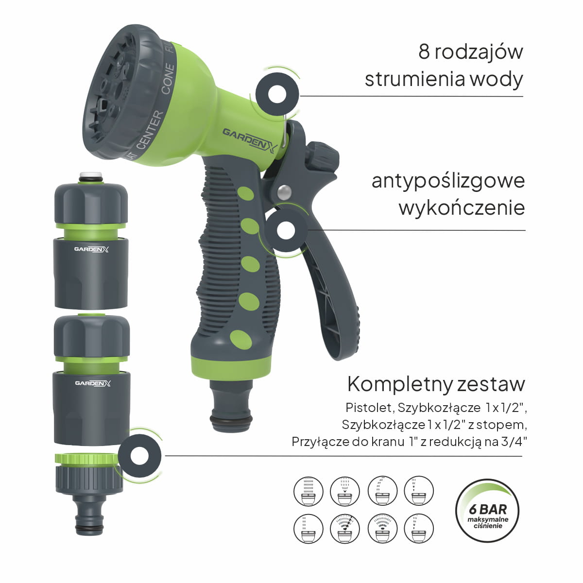 Zestaw GardenX TS2005 to wszechstronne i wygodne rozwiązanie do podlewania ogrodu, trawnika lub tarasu. Dzięki 8-stopniowej regulacji pistoletu możesz dostosować strumień wody do swoich potrzeb – od delikatnej mgiełki po mocny strumień.