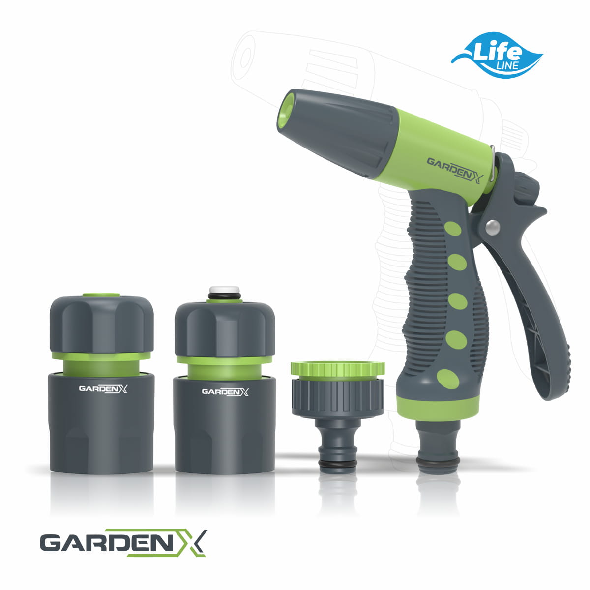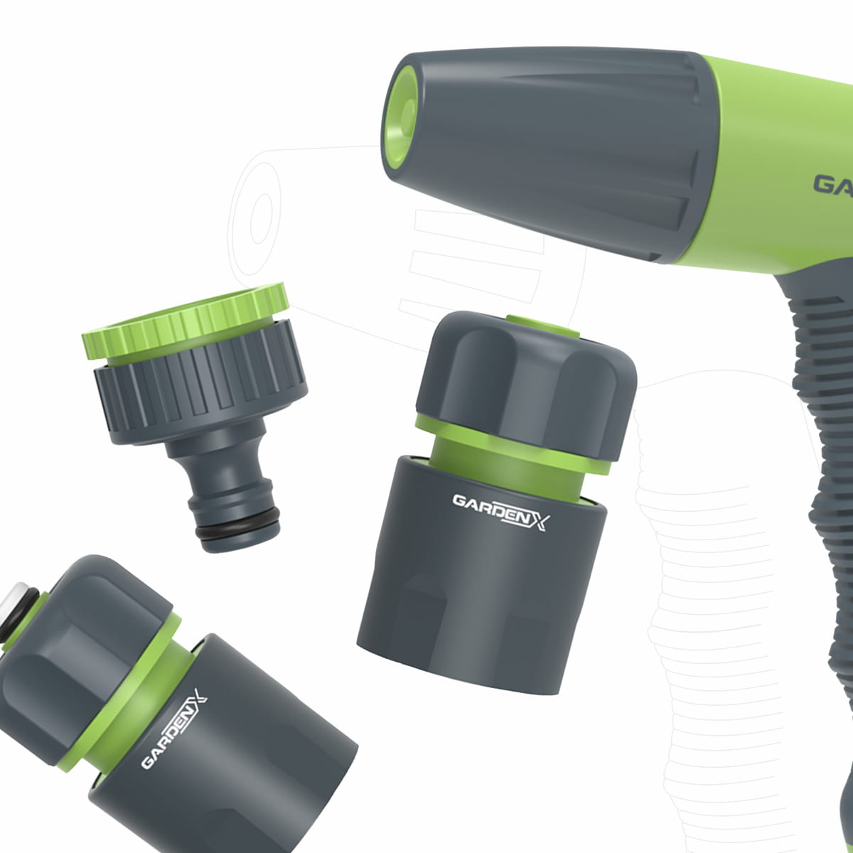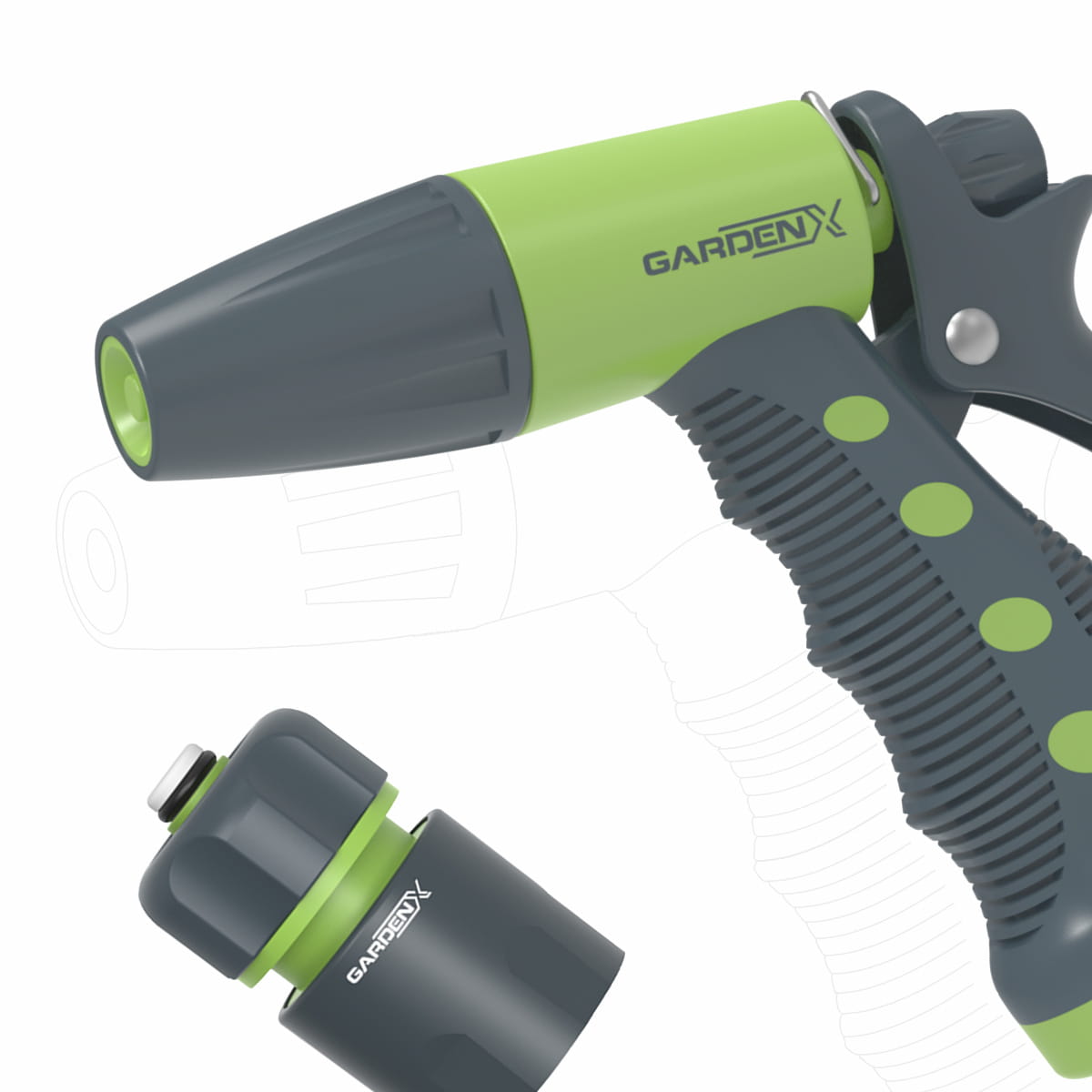 - Regulacja strumienia w pistolecie – możliwość dostosowania siły i rodzaju strumienia do różnych zastosowań: delikatne podlewanie roślin czy mocniejsze mycie.