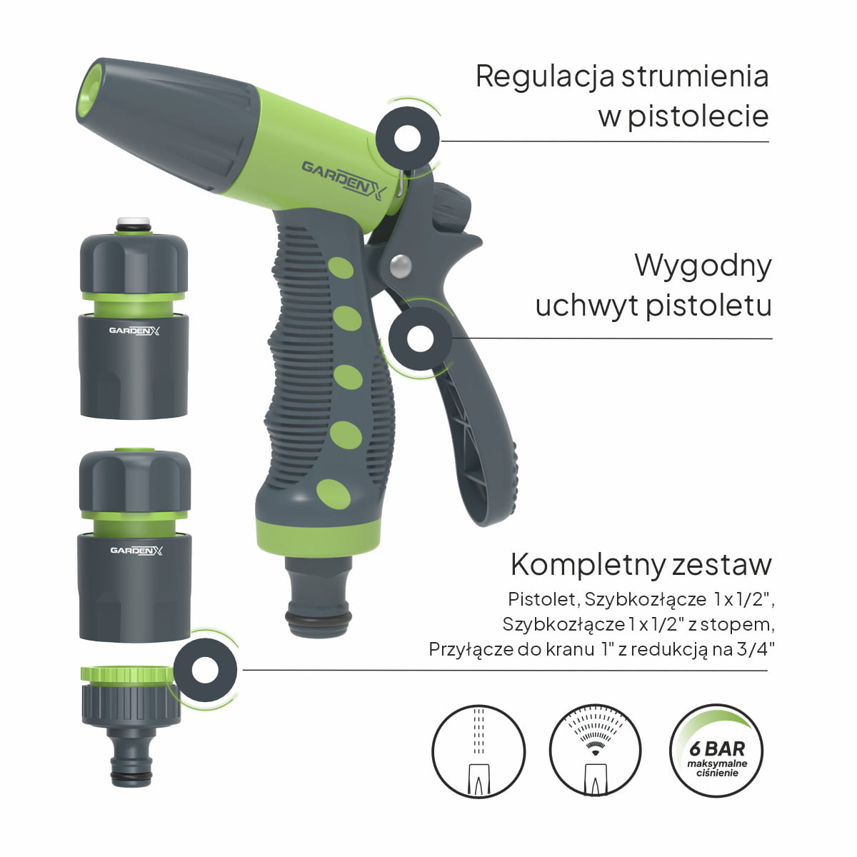 - Pistolet z regulacją strumienia (1 x 1/2")