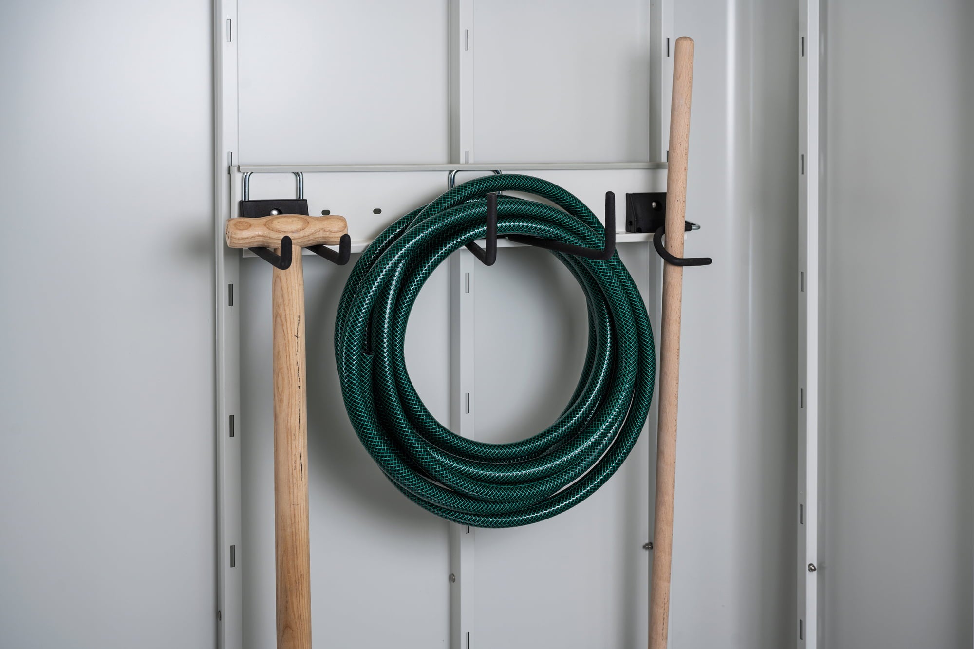 Zestaw zawiera jedną listwę ścienną oraz trzy haczyki: jeden typu combi, jeden do trzonków i jeden do łopat.